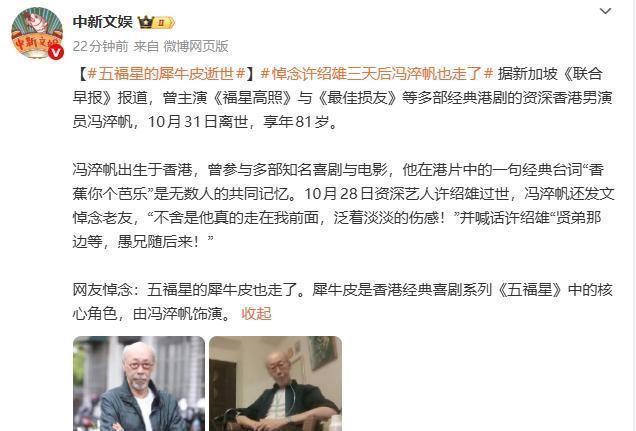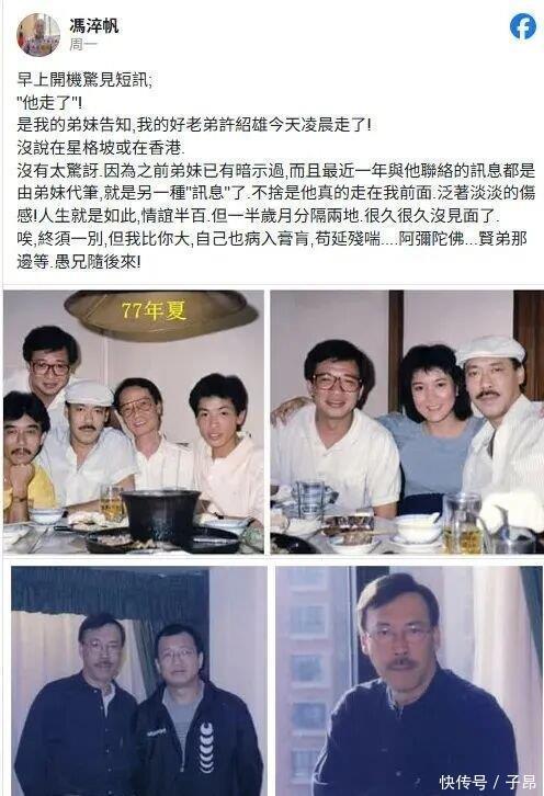 2025年10月31号晚上,81岁的冯淬帆在台湾去世,他在三天前发过一条消息,说“贤弟那边等,愚兄随后来”,这句话最后真的应验了,当时许绍雄刚刚离开人世,冯淬帆和许绍雄是多年朋友,现在回想起来那句话让人感到特别揪心,冯淬帆没有在香港去世,而是在台湾,大家这才知道他在晚年一直过得十分低调,住在哪里、平时做什么事,外面的人都不太清楚。